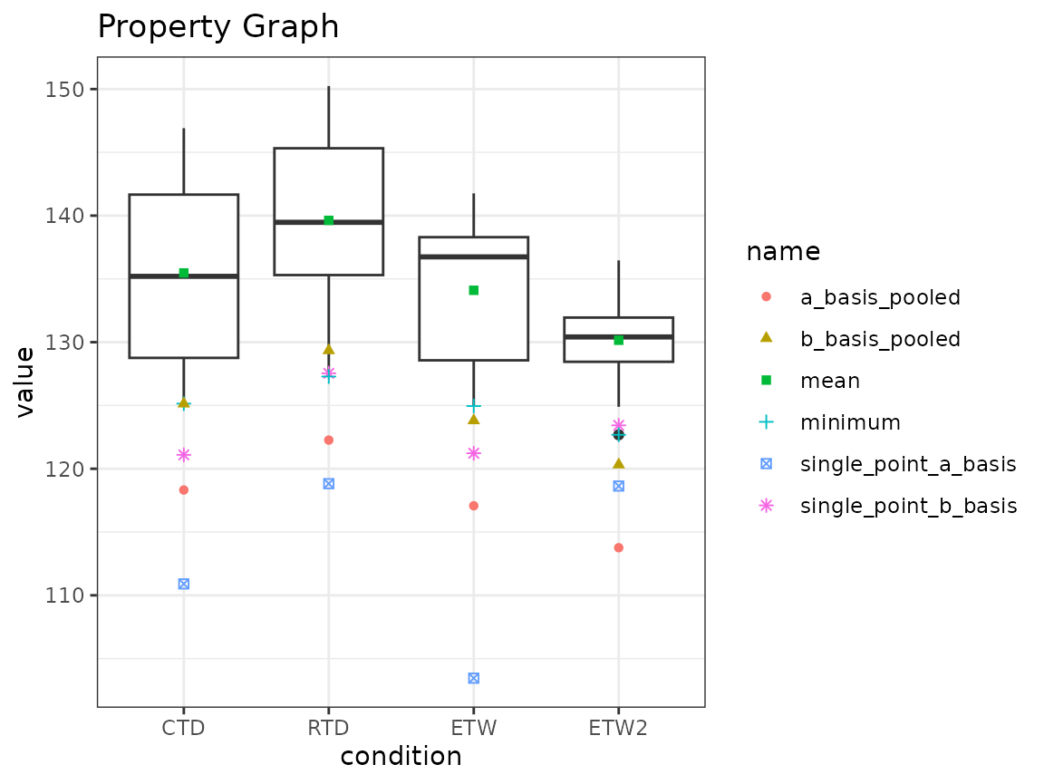 single_point_fcn <- function(group_x, group_batch, cond, basis_fcn, p) { fcn <- basis_fcn$fcn[basis_fcn$condition == cond[1]] extra_args <- basis_fcn$args[basis_fcn$condition == cond[1]] args <- c( list(x = group_x, batch = group_batch, p = p), unlist(extra_args)) basis <- do.call(fcn, args) basis$basis } single_point_results <- dat %>% group_by(condition) %>% summarise(single_point_b_basis = single_point_fcn( strength, batch, condition, b_basis_fcn, 0.90), single_point_a_basis = single_point_fcn( strength, batch, condition, a_basis_fcn, 0.99), minimum = min(strength), mean = mean(strength)) %>% mutate(condition = ordered(condition, c("CTD", "RTD", "ETW", "ETW2"))) #> `summarise()` ungrouping output (override with `.groups` argument) single_point_results #> # A tibble: 4 x 5 #> condition single_point_b_basis single_point_a_basis minimum mean #> <ord> <dbl> <dbl> <dbl> <dbl> #> 1 CTD 121. 111. 125. 135. #> 2 RTD 128. 119. 127. 140. #> 3 ETW 121. 103. 125. 134. #> 4 ETW2 123. 119. 123. 130.